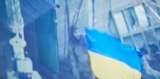 Ukrainians raise flag to show the fight goes on in city...